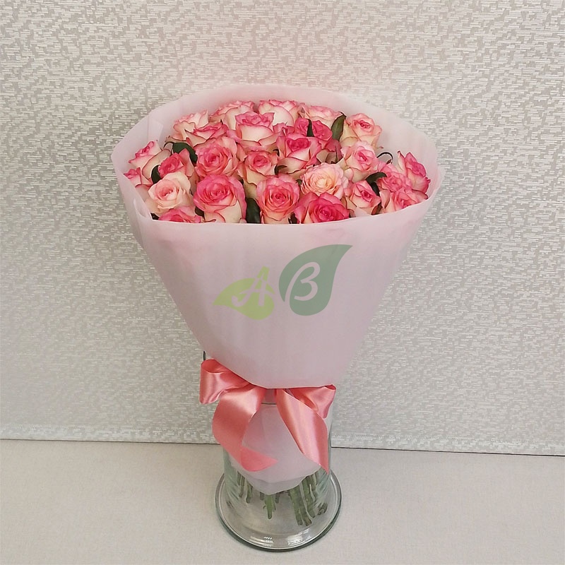 • Роза - 25 штук, цвет - бело-розовый, длина стебля - 60 см;