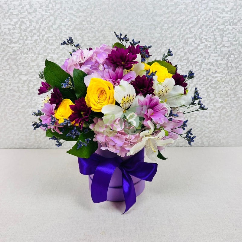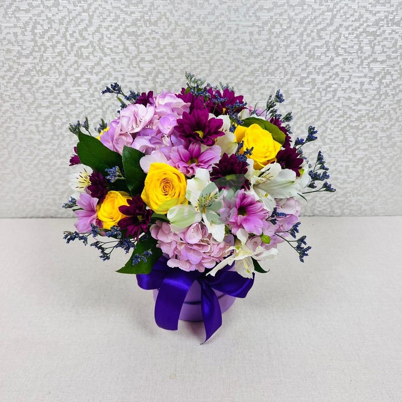 При покупке композиции из фиолетовых цветов в коробке доставка по Полысаево будет бесплатной.