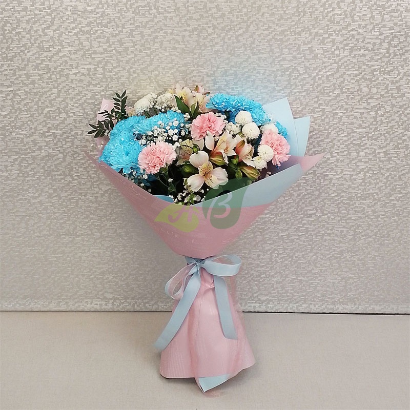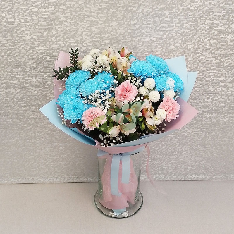 Сочетание голубого, белого и розового цветов замечательно подойдет для подарка как девушке, так и мужчине. Такой букет можно подарить и на выписку из роддома, и на свадьбу молодым.